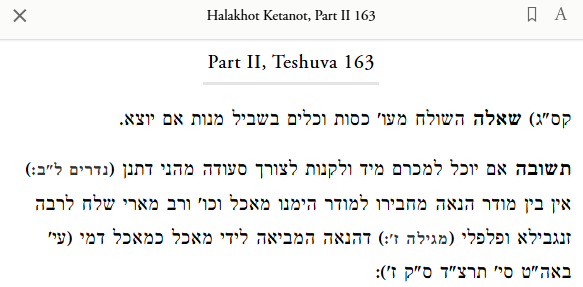 Majd ezt válaszolta: Más ajándékokkal is – például edényekkel vagy ruhákkal – is teljesíthető a kötelezettség, mondván, „ha azokat azonnal el tudja adni, és az árukból az étkezéshez szükséges dolgokat tud vásárolni, az érvényes megoldásnak számít”. Majd idézi a Talmudot, hogy ráv Mari küldött Rábának gyömbért és borsot, mert az az élvezet, amely végül étkezéshez vezet, az ételhez hasonlónak tekintendő.